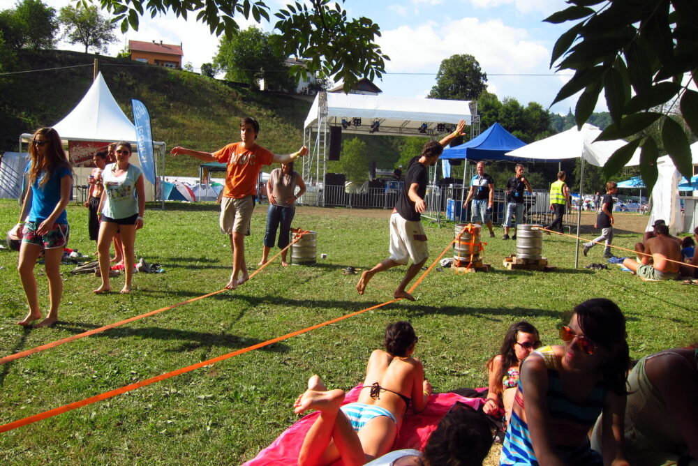 Na letošnjem Schengen festu ob Kolpi smo postavili mali slackline park in pomagali obiskovalcem pri prvih korakih na tresočem traku. Slackline-i na plaži so bili atraktivna dejavnost, ki je lepo popestrila dnevno dogajanje na festivalu.